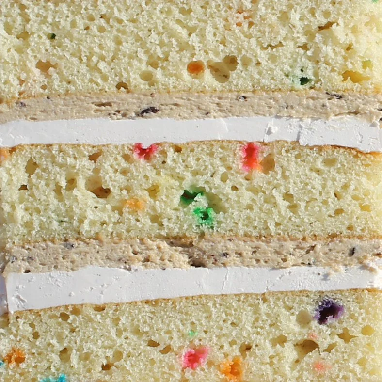 sprinkle vanilla cake, brown sugar choc chip cookie dough, vanilla bean buttercream.
